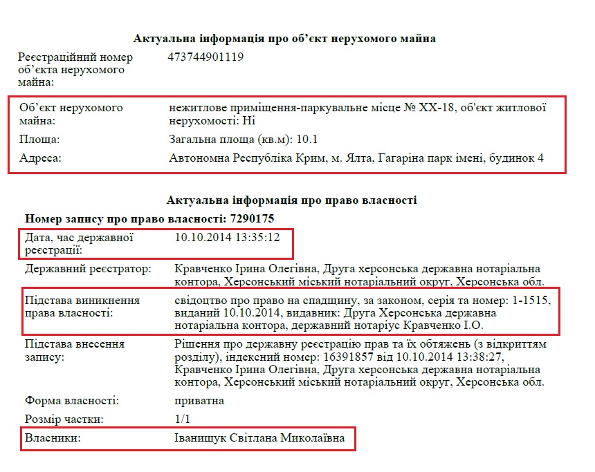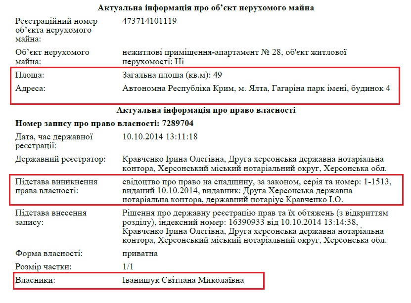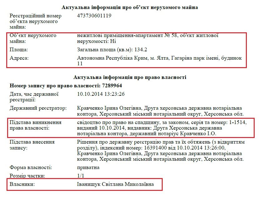 Проте, це не весь список майна, яким володіє Світлана Миколаївна. Так, у жовтні 2014 року пані Іванищук отримала чималу спадщину і в Криму, а саме: "нежитлові приміщення-апартаменти" загальною площею 183м² та паркомісце в Ялті.