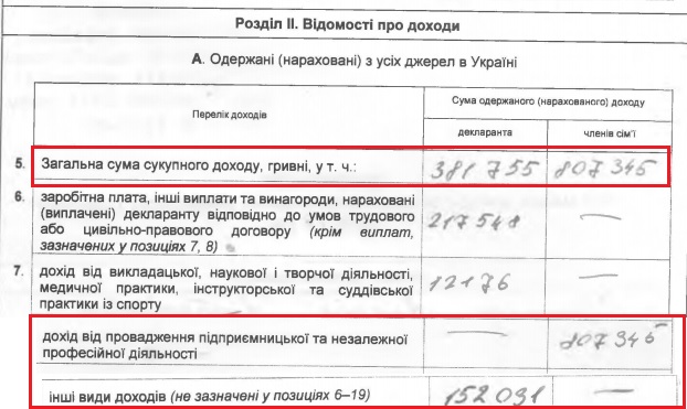 Так, згідно з декларацією за 2014 рік, члени родини пана Іванищука отримали дохід від провадження підприємницької та незалежної професійної діяльності в розмірі 807тис.грн. Дохід же самого пана Іванищука в більш ніж 2 рази менший та в основному складається із заробітної плати судді та «інших видів доходів».