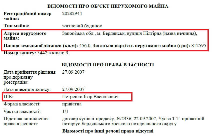 Другий будинок з’явився у власності судді Ігоря Петренко вже через рік після придбання першого, в 2007 році. Знаходиться він у місті Бердянськ (Запорізька обл.), а офіційна вартість даного будинку, згідно реєстру, в 2007 році склала більше 800тис.грн. або 160тис.$ за тодішнім курсом.