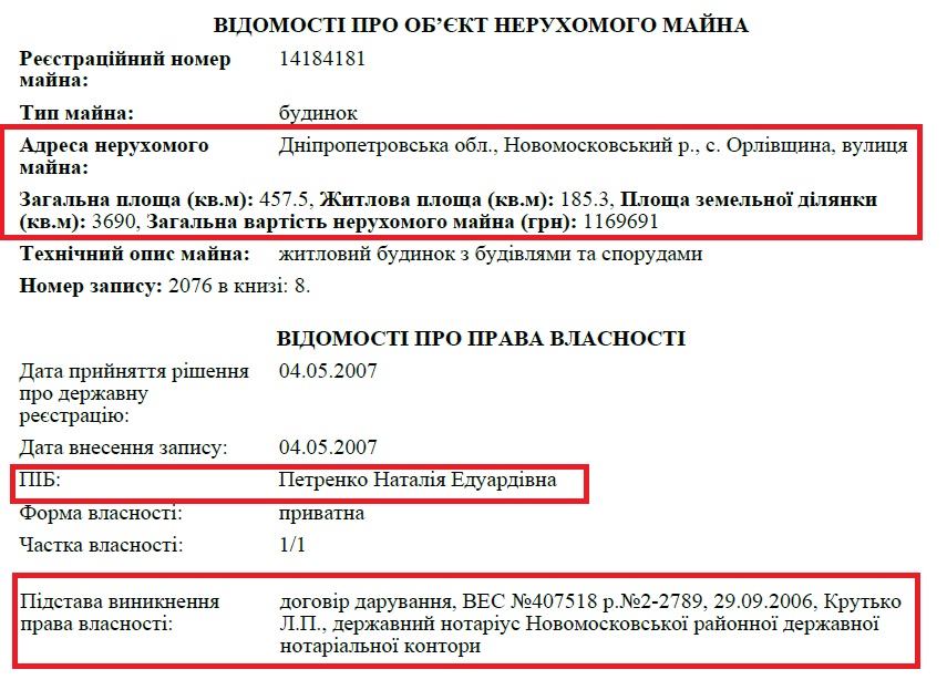 Згідно декларації та Державного реєстру речових прав на нерухоме майно, володіє суддя Петренко чималим будинком площею 457м² з власною церквою на подвір’ї. До речі, за гарною суддівською традицією, цей будинок їй... подарували. Згідно реєстру, вартість такого «подарунку» в 2007 році була понад 1млн.грн. або 233тис.$ за тодішнім курсом.
