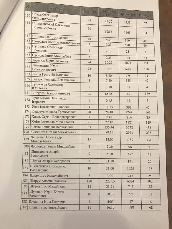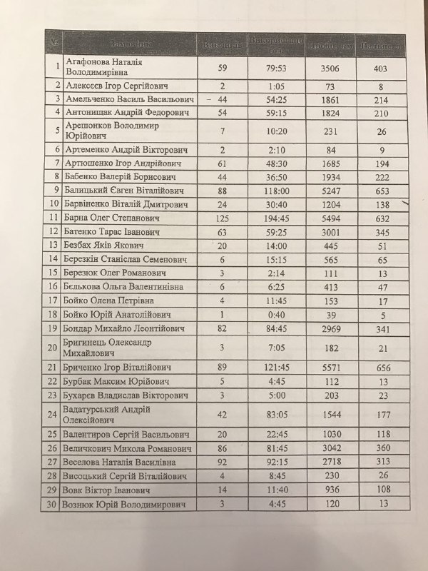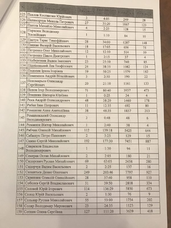 Также активно используют машины Юрий Соловей (136 часов, 675 литов топлива), Евгений Балицкий (118 часов, 653 литра топлива), Олег Барна (195 часов, 630 литров топлива), Юрий Левченко (200 часов, 700 литров топлива), Алексей Гончаренко (156 часов, 680 литров Топлива), Оксана Корчинская (128 ччасов, 600 литров топлива), Алена Шкрум (222 часа, 704 литра топлива).
