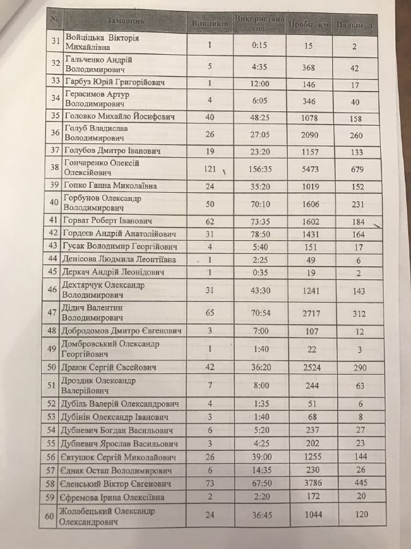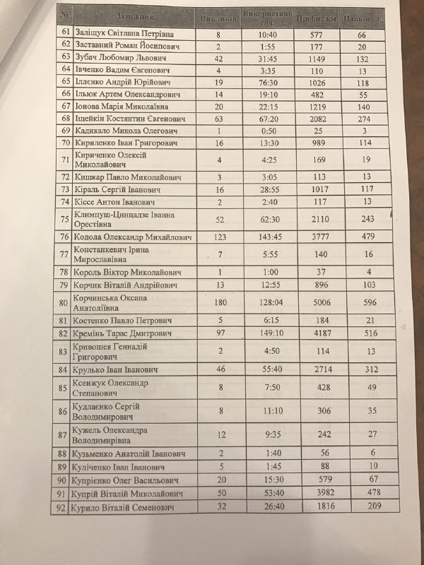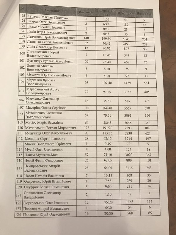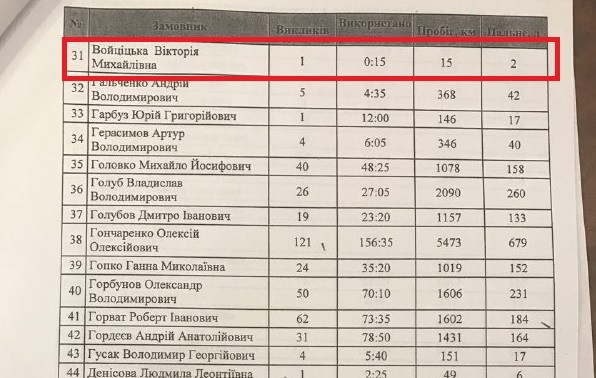 Меньше всех использовала авто автопарка Виктория Войцицкая (“Самопомощь”). У нее всего 1 вызов, она проехала 15 км и потратила 2 литра топлива.
