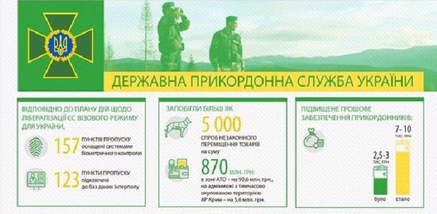 Государственная пограничная служба Украины провела работу по подготовке к безвизовому режиму с ЕС, также преселка незаконное перемещение товаров на 870 млн грн. Повысилась зарплата пограничников.