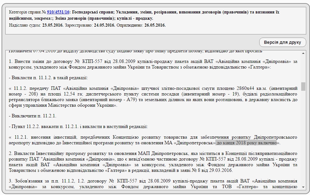 9 февраля 2016 года представители Фонда госимущества обратились в Хозяйственный суд Днепропетровской области с требованием разорвать договор и вернуть акции авиакомпании государству. Слушания откладывали и на сегодняшний день производство по делу приостановили.