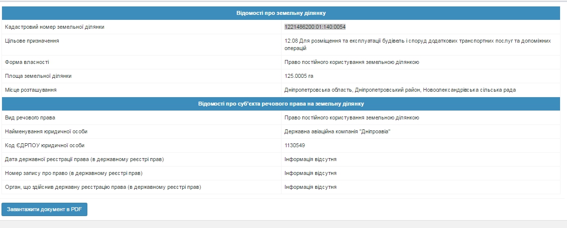 По данным кадастровой карты, земля, на которой расположен аэропорт, принадлежит государству. Участок в 125,0005 га на праве постоянного пользования закреплен за компанией «Дніпроавіа».