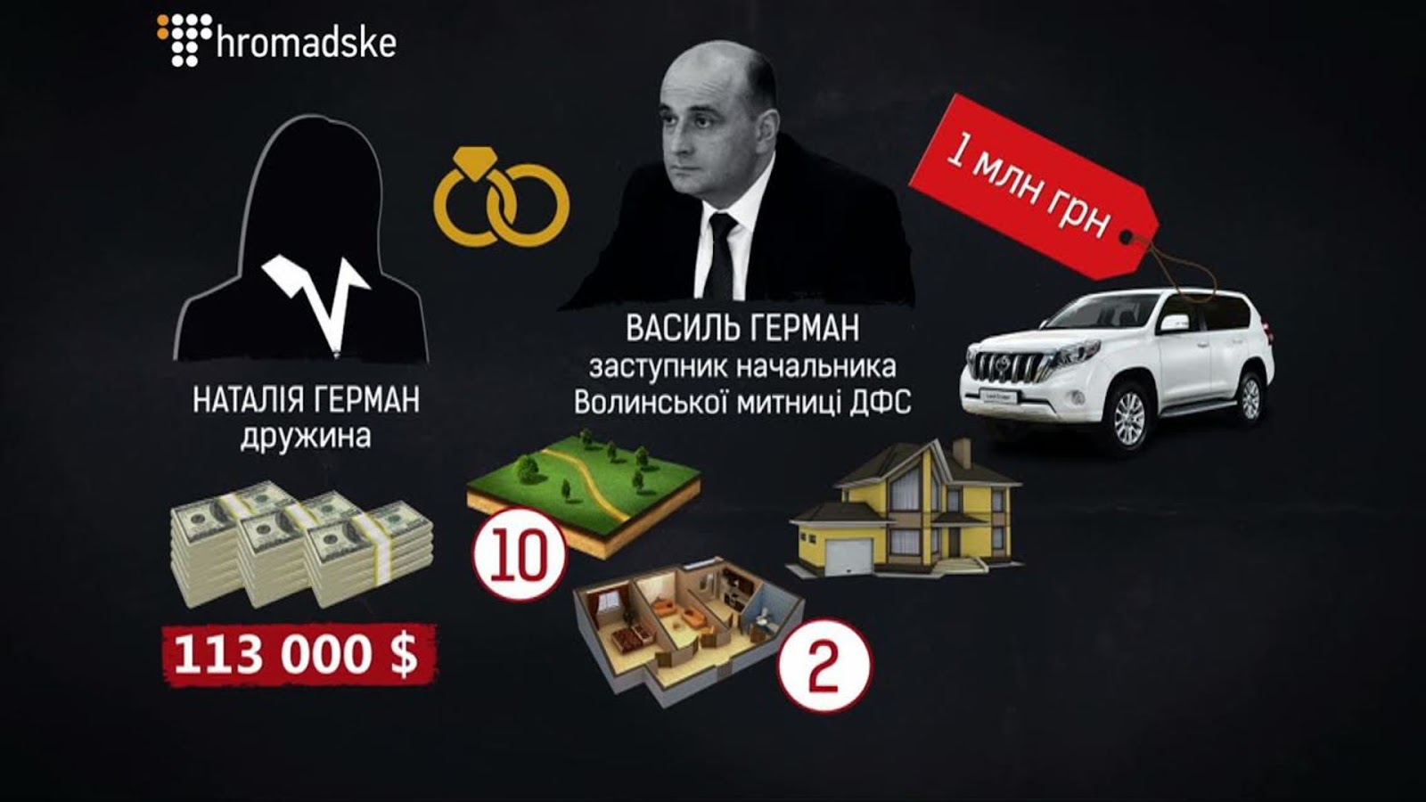 Это заместитель начальника Волынской таможни — Василий Герман. У него с семьей десять земельных участков, дом и две квартиры в новостройках. Жена Германа задекларировала 113 000 долларов. А какое-то щедрое третье лицо предоставило волынскому таможеннику джип «Тойота Лендкрузер» стоимостью более миллиона гривен.