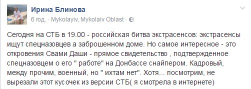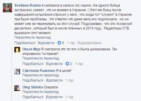 «Я смотрела в записи эту серию. На одного бойца экстрасенс укажет, что он воевал в Украине. Подозреваю, что это псковский десантник, который был в числе пленных в 2014 году. Редакторы СТБ вырезали этот момент», — написала Светлана Козина.