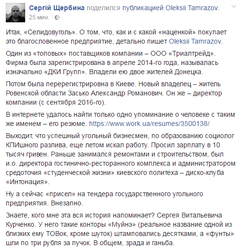 "Новый владелец – житель Ровенской области Засько Александр Романович. Он же – директор компании… Успешный угольный бизнесмен, по образованию социолог КПИшного разлива занимался ремонтами и строительством", – отметил Щербина