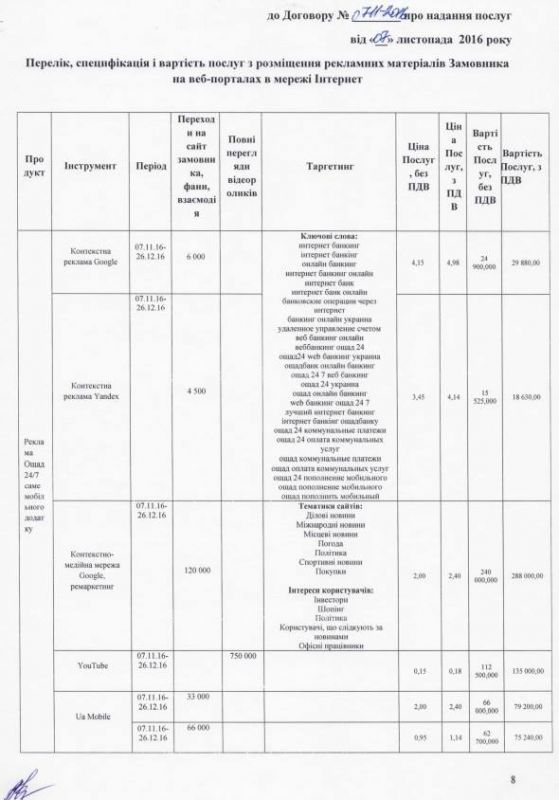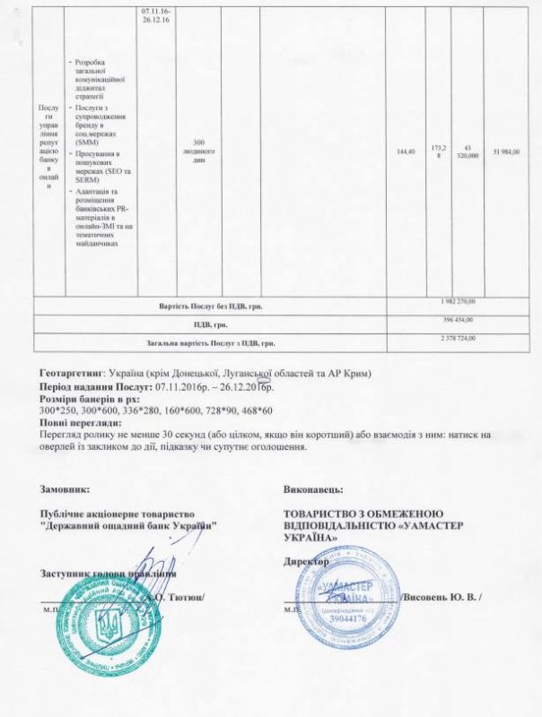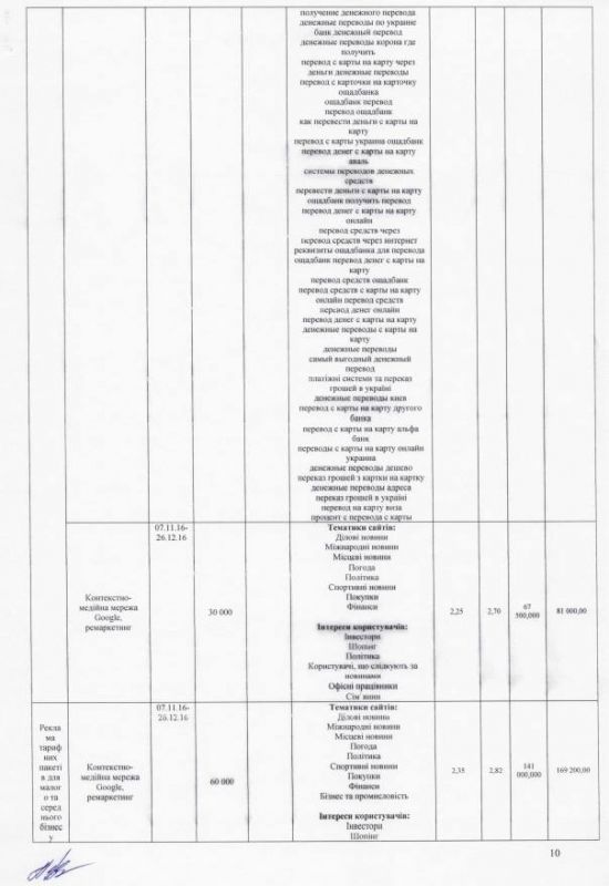 "Ощадбанк" замовив рекламу в російському Яндексі. Копія документа