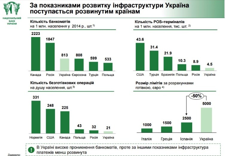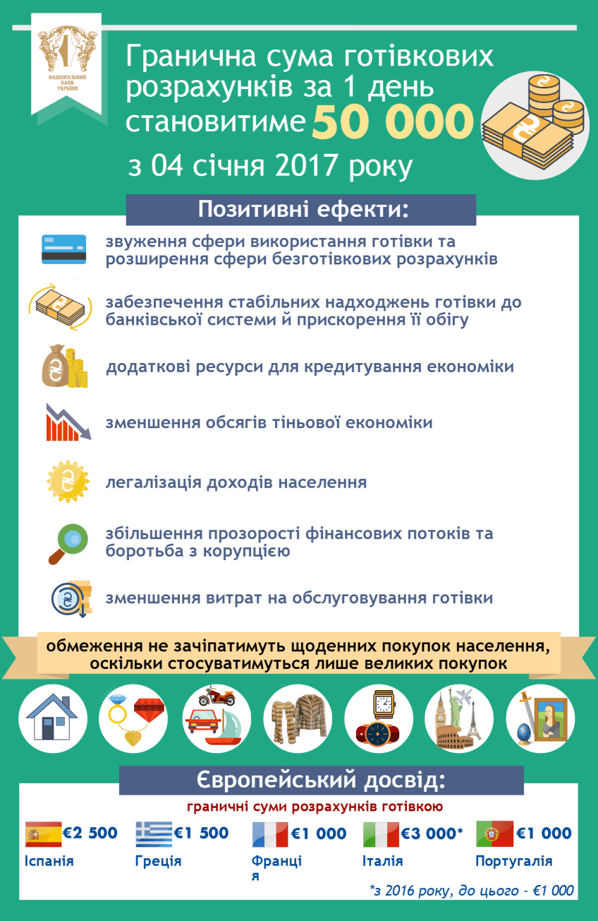 «Украинцы убедились, что введение в сентябре 2013 года ограничения на наличные расчеты в сумме 150 тыс. грн, не задело интересов большинства из них, поскольку касалось только крупных покупок (например, приобретения престижных автомобилей и мотоциклов, яхт, самолетов, домов, антиквариата, драгоценностей) и способствовало постепенному восприятию населением необходимости применения безналичных расчетов и повышения их привлекательности», – говорится в ответе НБУ на запрос агентства АСН.