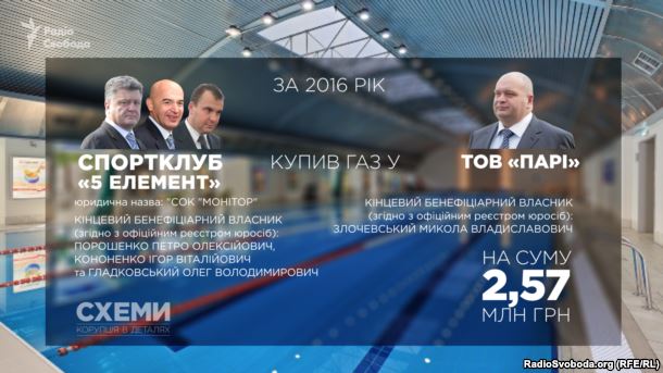 «Спортивно-оздоровчий комплекс «Монітор», більш відомий як елітний фітнес-клуб «5-й елемент». Його заснували фонди трьох бізнес-партнерів – Порошенка, Кононенка та Гладковського. Фітнес-клуб «5-й елемент» – один із найбільш відомих активів президента та його соратників – також забезпечений газом від фірм Миколи Злочевського. У 2016 році спортклуб придбав газу у фірми «Парі» на суму більше ніж 2,5 мільйона гривень.