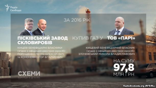 «Пісківський завод скловиробів» на Київщині. Його власники – фонд «Прайм Ессетс Кепітал» Порошенка та фонд «Вік» Кононенка. Безперебійне постачання газу на завод – гарантія сталого виробництва. Увесь 2016 рік завод купував його у фірми Миколи Злочевського – ТОВ «Парі», сплативши за газ майже 100 мільйонів гривень.