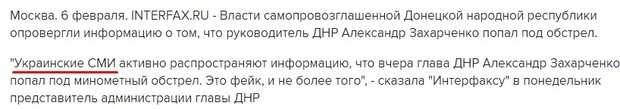 В понедельник, 6 февраля, ряд прокремлевских изданий сообщили о том, что Вооруженные силы Украины обстреляли кортеж боевика из минометов. В частности, об этом написали такие сайты, как "Звезда", "Комсомольская правда в России", "Эксперт", "Регнум" и т.д.
