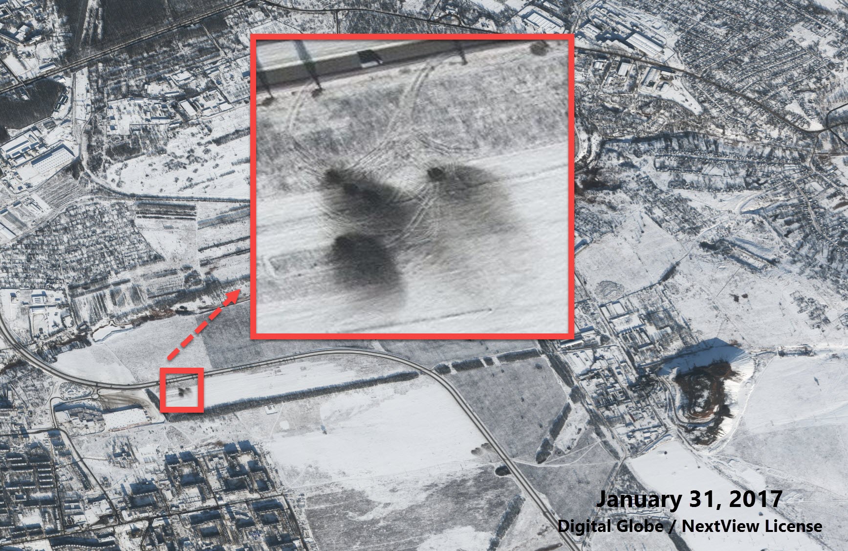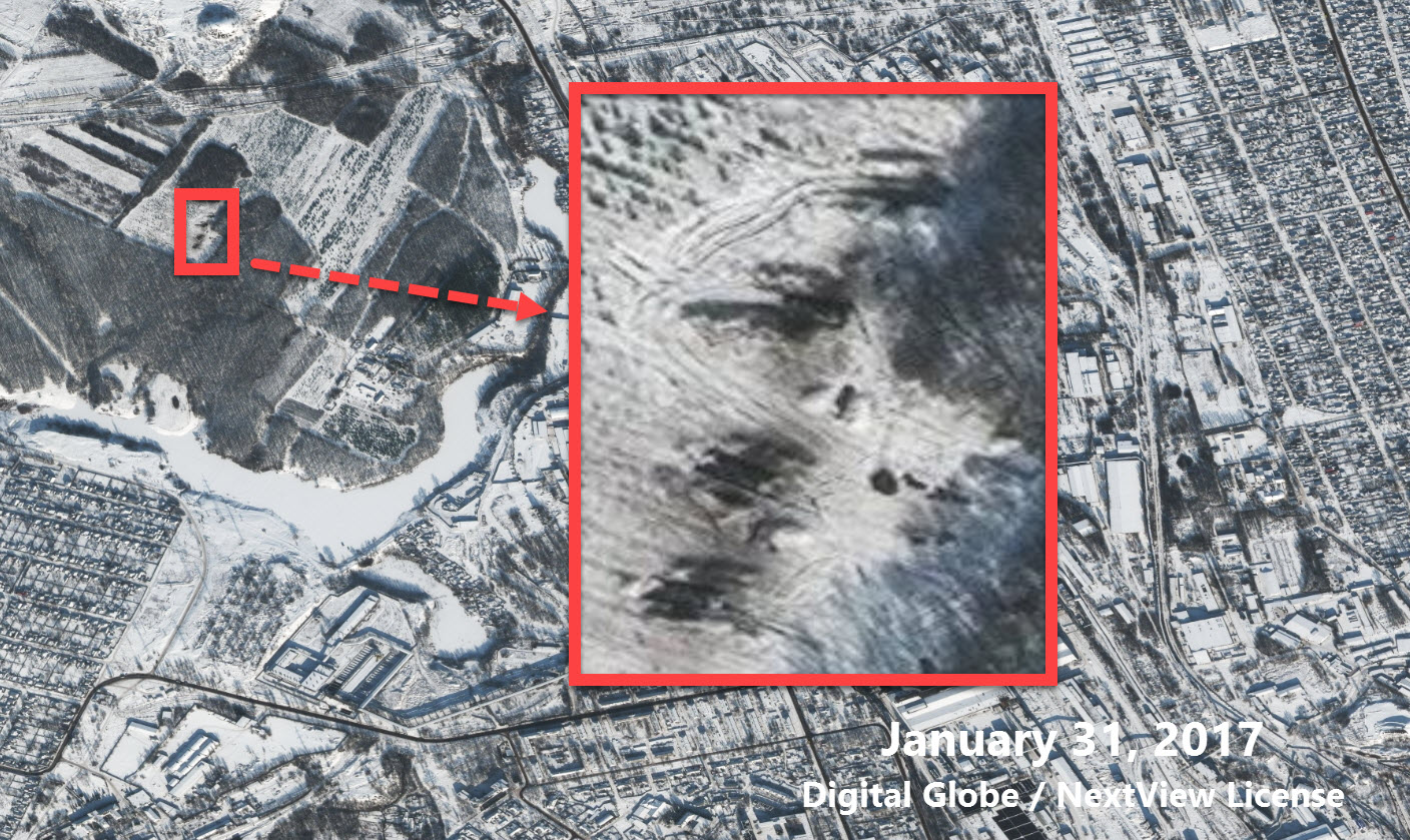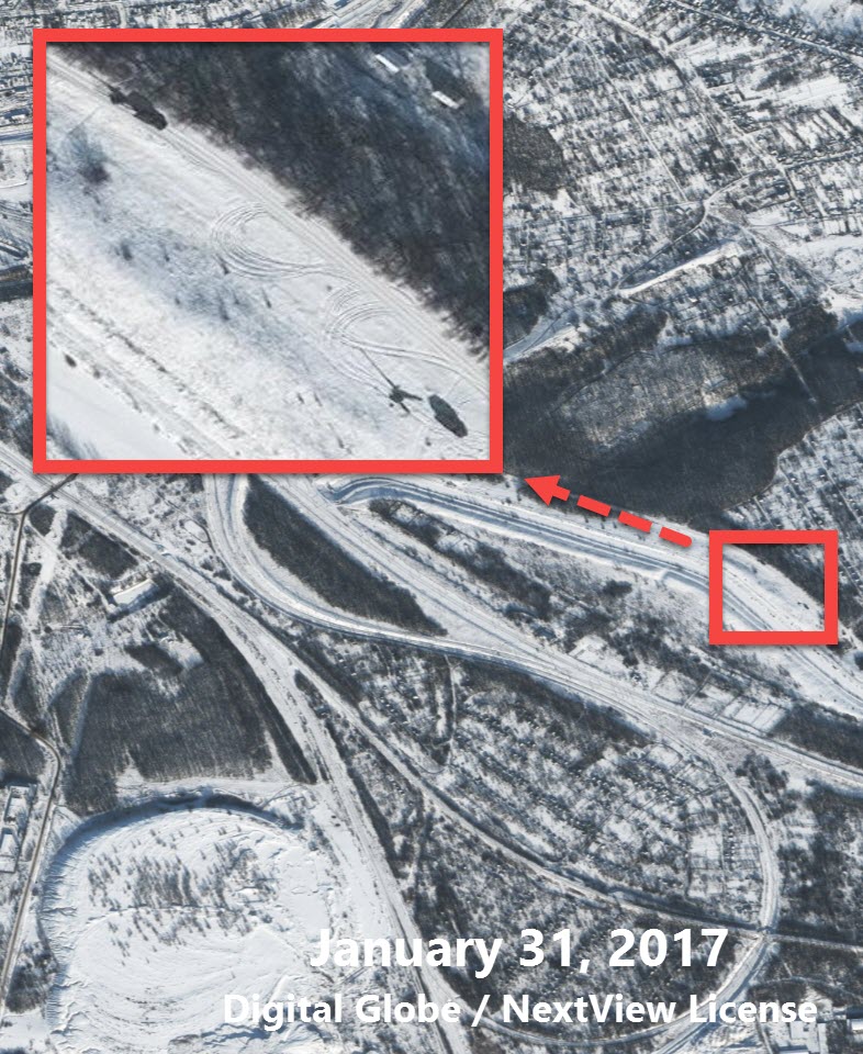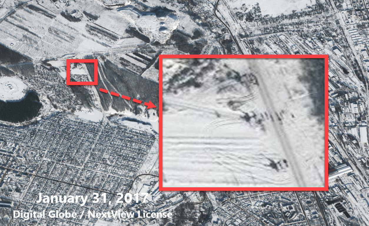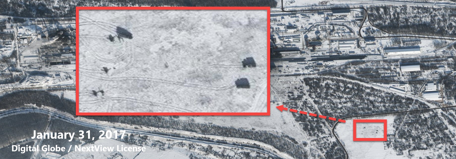 "Судя по всему, СММ ОБСЕ наблюдала несколько образцов военной техники, попавших на спутниковый снимок от 31 января 2017 года. В своем ежедневном отчете о нарушениях за 1 февраля СММ ОБСЕ в Украине описывает несколько объектов, соответствующих технике и местам, наблюдаемым на спутниковом снимке", - говорится в статье.