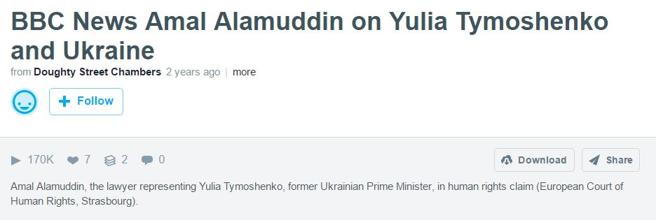 Мало кому известен и очень интересный факт о том, что именно Амаль Аламуддин представляла интересы лидера "Батькивщины" Юлии Тимошенко в Европейском суде по правам человека. По крайней мере, именно так представляет ее информационная служба ВВС в своем сюжете, а также эта информация значится в "Википедии", открытой интернет-энциклопедии.