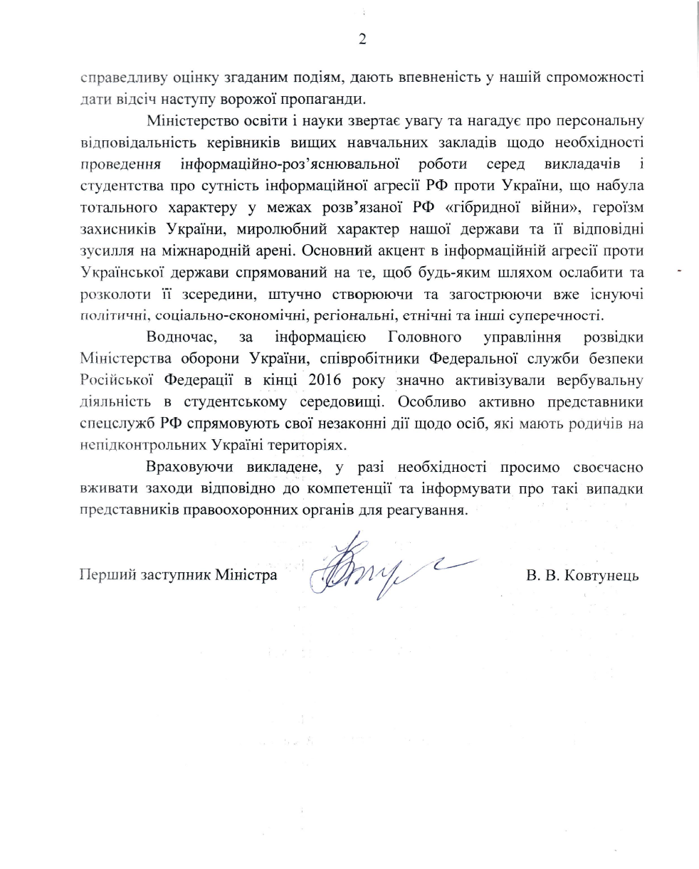 При этом министерство "напоминает о персональной ответственности руководителей вузов за проведение информационно-разъяснительной работы среди преподавателей и студентов о сути информационной агрессии РФ против Украины" а также о "миролюбивом характере нашей державы". Подчёркивается, что "основной акцент в информационной агрессии против Украинской державы направлен на то, чтобы расколоть её, искусственно создавая и заостряя… социально-экономические, региональные, этнические и другие противоречия".