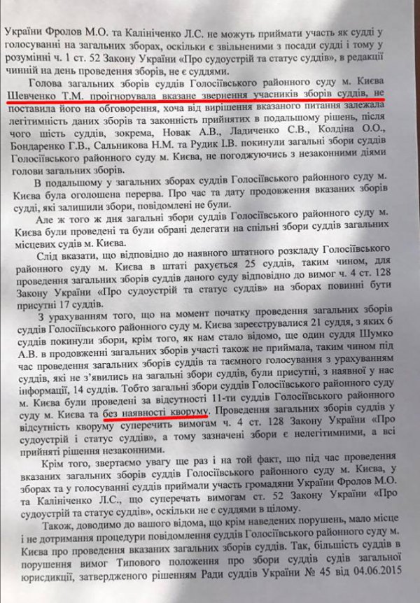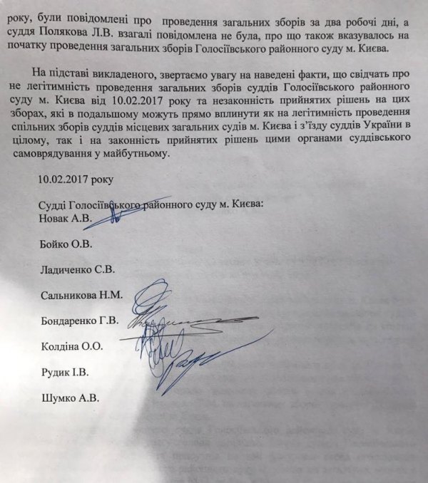 В пятницу треть судей Голосеевского суда резко не согласилась с такими действиями Первушиной, покинули собрание и даже заявили публичный протест. Кстати, очень радует, что уже не все судьи покорно молчат, а готовы бороться против явного произвола. Это вселяет надежду.