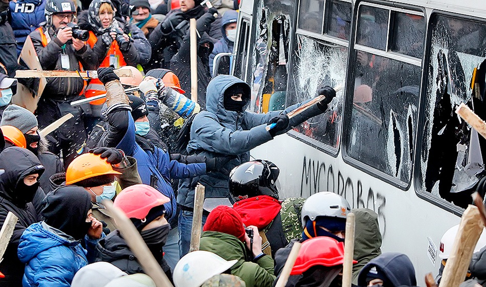 19 января, вторая волна противостояния, милицейские автобусы на Грушевского крушат митингующие. Фото Reuters