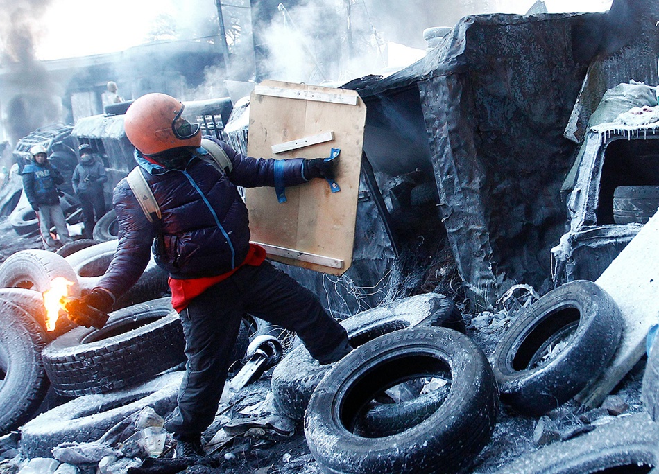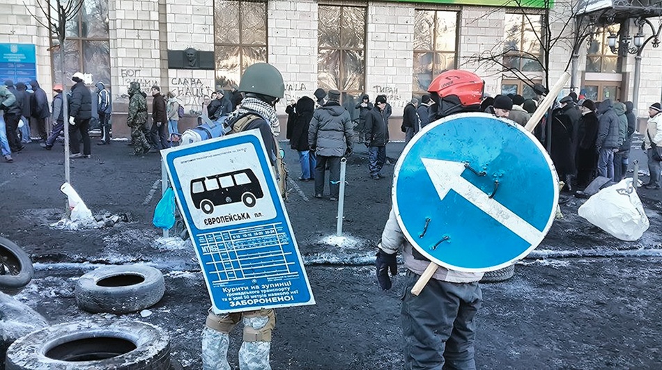 24 января, дорожные знаки вместо щитов у митингующих. Фото с сайта ukraine-revolution.tumblr.com.