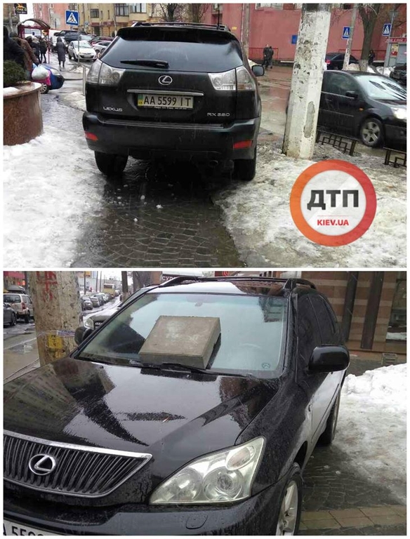 Как видно на фото, недовольные пешеходы отомстили водителю, положив на лобовое стекло его машины огромную тротуарную плитку.