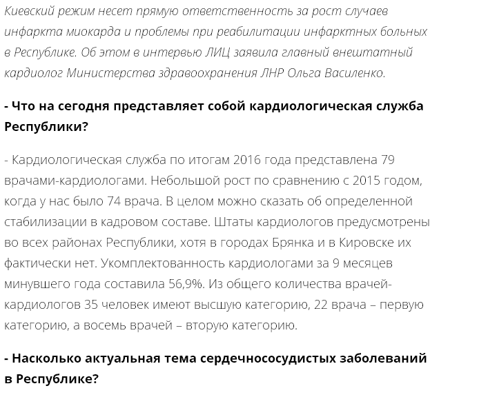 Цитата: "Киевский режим несет прямую ответственность за рост случаев инфаркта миокарда и проблемы при реабилитации инфарктных больных в Республике". Об этом в интервью ЛИЦ заявила главный внештатный кардиолог Министерства здравоохранения ЛНР Ольга Василенко.