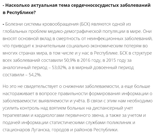Вашему вниманию цитата главного внештатного кардиолога Министерства здравоохранения "ЛНР" Ольги Василенко, взятая с сайта "ЛИЦ". Она, как нельзя лучше поясняет, что в «лнр» вместо медицинской помощи людям предлагают скрепы и пропаганду. И, да, люди в "ЛНР" умирают. Если не от болезней, так от "медицинской помощи".