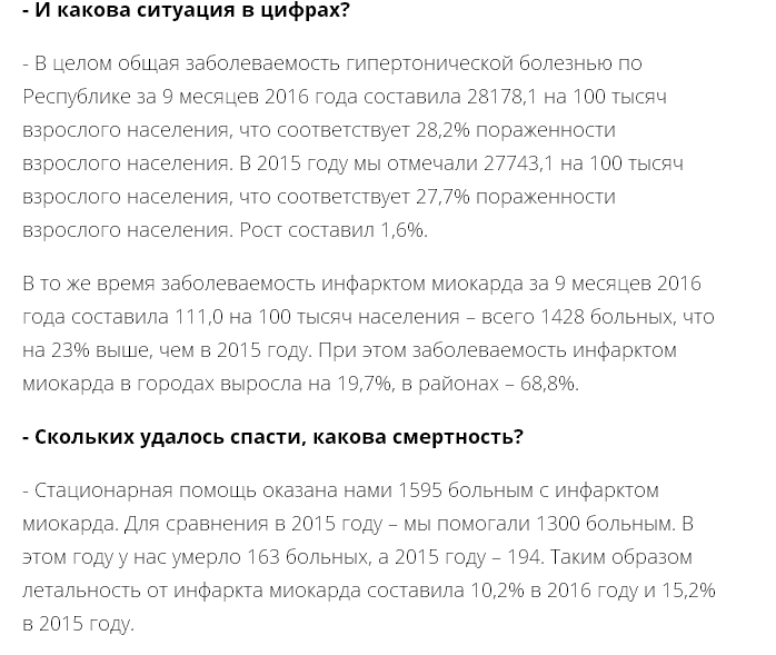 - Стационарная помощь оказана нами 1595 больным с инфарктом миокарда. Для сравнения в 2015 году – мы помогали 1300 больным. В этом году у нас умерло 163 больных, а 2015 году – 194. Таким образом летальность от инфаркта миокарда составила 10,2% в 2016 году и 15,2% в 2015 году.