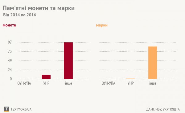 В 2014-2016 годах Национальный банк Украины выпустил 108 памятных монет. Укрпочта выпустила за то же время 87 художественных марок. Тематике Украинской революции посвящено 11 монет и 1 марка (к 150-летию Михаила Грушевского). На сайтах НБУ или Укрпочты не удалось найти ни одной монеты или марки 2014-2016 годов, которые были посвящены Бандере, ОУН или УПА.
