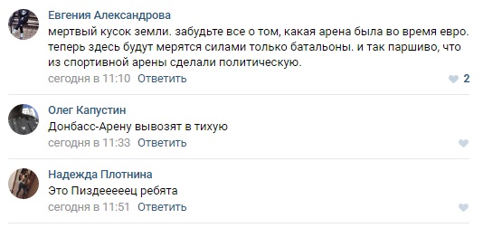 "Инновация" террористов вызвала бурные обсуждения подписчиков паблика, которые с горечью отметили, что раньше на стадионе проходили матчи легендарных команд, зрелищные концерты, а теперь здесь будут бегать недоноски из таких же недореспублик.