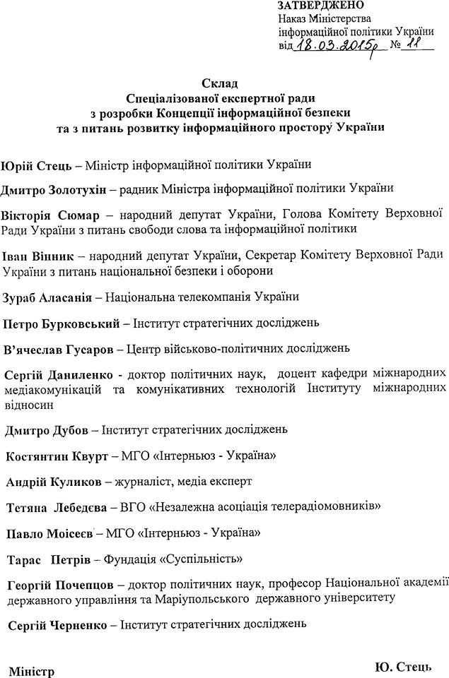 В состав Экспертного совета, который и должен утвердить список "антиукраинских" сайтов вошло 16 участников, среди которых депутаты, журналисты и медиаэксперты, сообщают в Мининформполитики. "Страна" публикует полный персональный перечень совета: