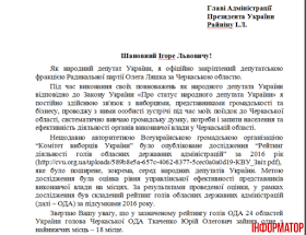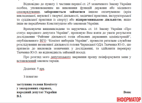 «3 огляду на обширну інформацію, яку я отримую під час численних зустрічей з виборцями, представниками громадськості й бізнесу Черкаської області та моніторингу діяльності Черкаської ОДА, діяльність голови Черкаської ОДА Ткаченка Ю.О. я охарактеризував би як діяльність особи, яка переймається передусім своїми особистими бізнес-інтересами, перебуваючи на державній посаді», – погоджується з висновком експертів КВУ у своєму депутатському зверненні представник парламентської фракції Радикальної партії Віктор Вовк.
