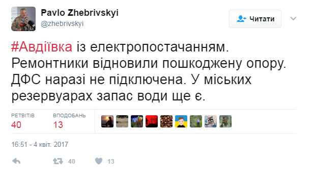 "Авдеевка с электроснабжением. Ремонтники восстановили поврежденную опору", - сообщил председатель Донецкой военно-гражданской администрации Павел Жебривский.