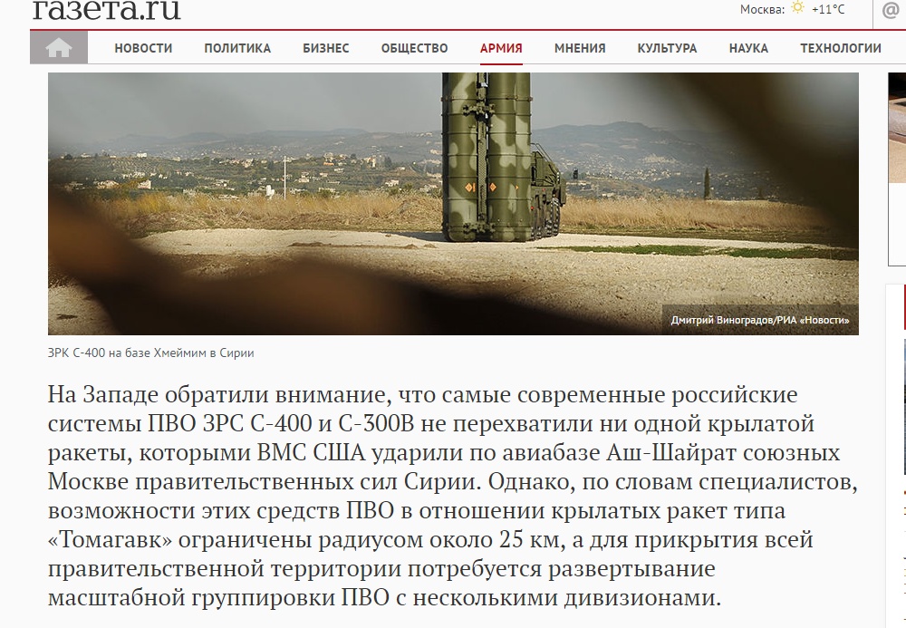 К примеру, когда Президентом был Обама, грозный «Триумф» с-400, апофеоз российского инженерного гения, гордо контролировал каждый сантиметр воздушного купола над Сирией на 400 километров. В том числе, по многочисленным заявлениям российских СМИ, которые легко найти в интернете, четко контролируя небо над авиабазой Аль-Шайрат.