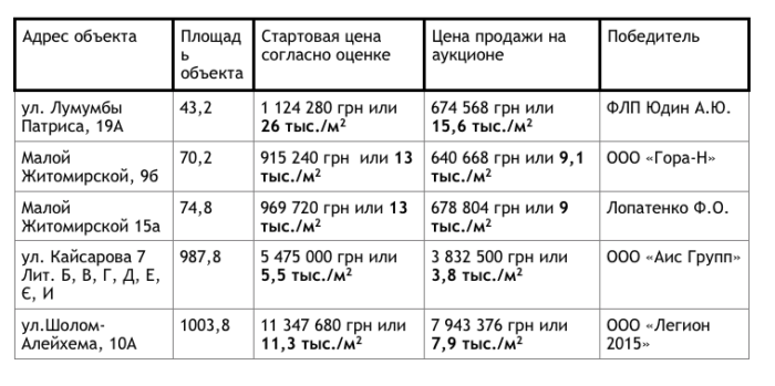 Настораживает также тот факт, что при явном дефиците и востребованности нежилых помещений в Киеве, особенно в центральной его части, на первый аукцион никто не подал заявки на участие, а на повторные постоянно выходили только лишь два претендента. Таким образом, итоговая стоимость еще больше понижалась.