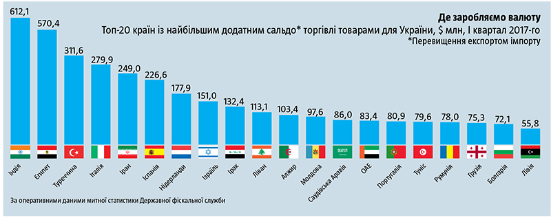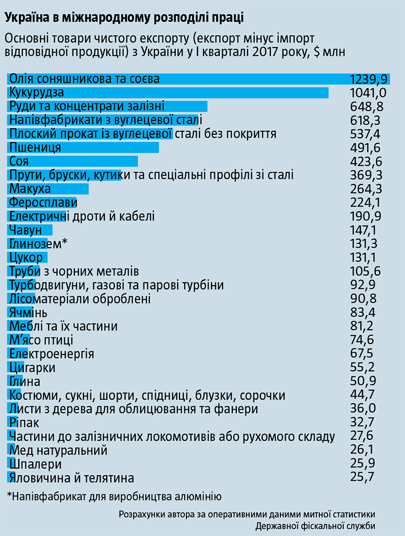 Из первых 30 товаров украинского чистого экспорта (экспорт определенной продукции минус ее импорт) в I квартале 2017 года большинство - это сырье и полуфабрикаты. В то же время, несмотря на устоявшиеся стереотипы, заметно, что современная Украина в международном разделении труда специализируется не только на продукции агропромышленного комплекса (АПК) или горно-металлургического комплекса (ГМК). Начиная со второй десятки в топ-30 крупнейших по объемам чистого экспорта товаров входит и ряд изделий электротехнической, деревообрабатывающей, мебельной, табачной, легкой промышленности, а также электроэнергия и обои. А среди продовольственной группы в последнее время все более заметным является рост чистого экспорта сахара, мяса птицы и говядины.