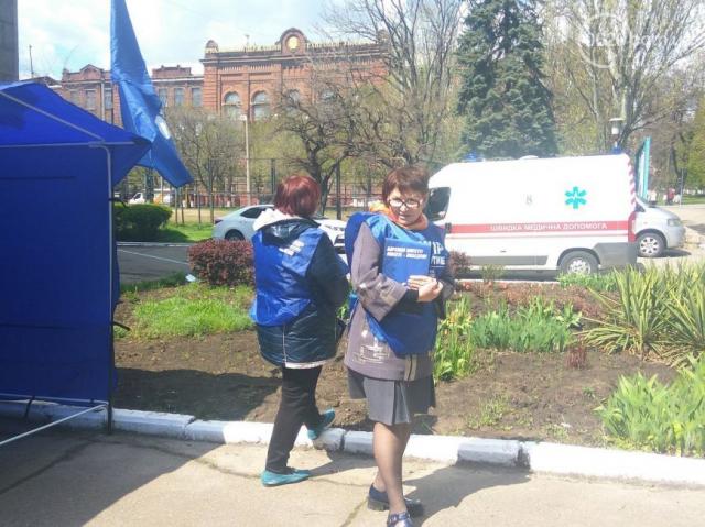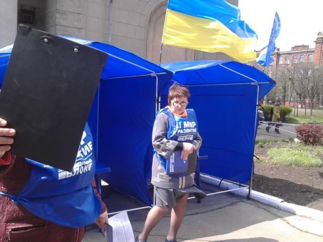 Женщины в жилетках с надписью «Оппозиционный блок» и За! Мир и развитие» раздают листовки и собирают подписи.