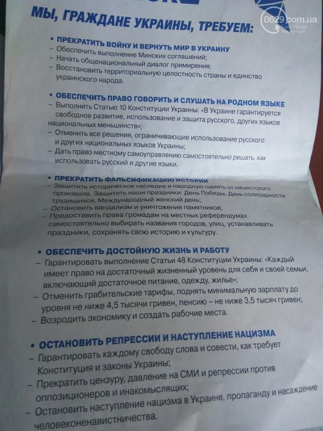 Среди пунктов в указанных листовках — обеспечение Минских договоренностей, начало общенационального примирения, восстановление территориальной целостности страны, возрождение экономики, рабочих мест, отмена «грабительских» тарифов. Однако мариупольцев возмутило требование по отмене всех законов, ограничивающих ущемление русского языка.