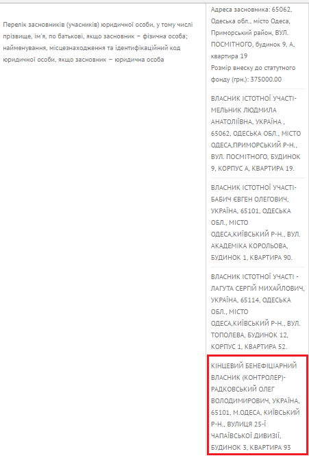 В этой же квартире на улице Гоголя,7 управляет своими фирмами второй бизнес-партнер Радковского Сергей Прохоров. Вместе они учились в Одесском технологическом институте холодильной промышленности. На Прохорова по этой жилплощади зарегистрирована строительная фирма «Будмаш-проект» и компания «Марин-инвест», которая с разрешения мэрии в 2014 году планировала возвести небоскребы на Деволановском спуске в Одессе. При этом уставный фонд компании составляет лишь 20,5 тысяч гривен, а пятью годами ранее – в 2009 году она и вовсе лишилась лицензии от налоговиков.