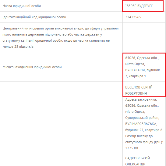 В этой квартире «отметился» и Сергей Веселов – правая рука Радковского по политическим вопросам. В 1995 году он стал бенефециаром компании «Берег-Сервис», а в 2003 году был в числе создателей «Берег-Будгруп» все по тому же адресу – улица Гоголя, 15. Обе компании были причастны к появлению недостроев в Одессе.