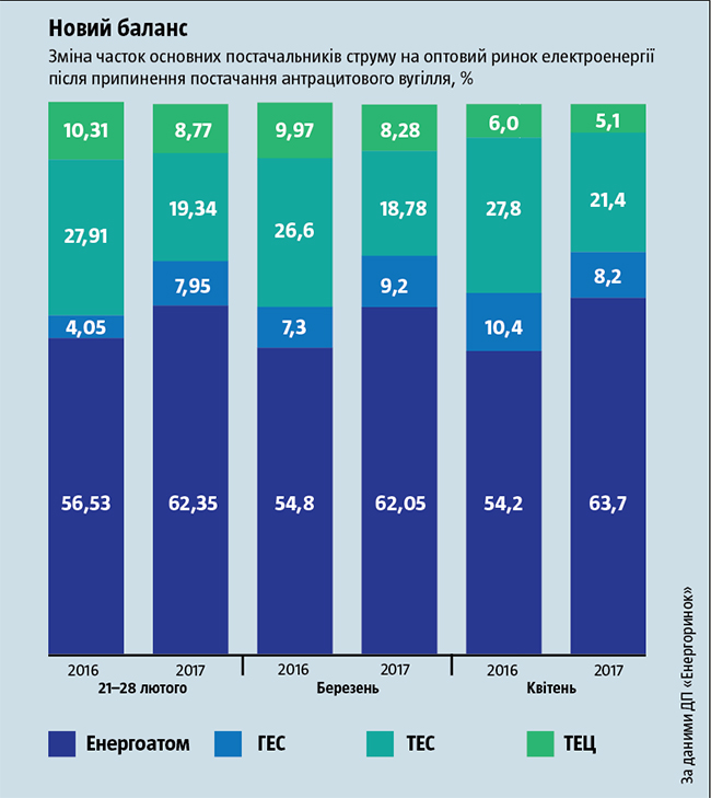 Прежде всего анализ данных ГП «Энергорынок» за февраль, когда впервые были приняты меры по экономии антрацита и замене генерации электроэнергии блоками ТЭС, работающих на нем, на электричество с АЭС, ГЭС и произведенного из газового угля, подтвердил расчеты Тижня о возможности почти полного отказа от дефицитного топлива с оккупированных территорий. В последнюю декаду февраля, а также в марте и апреле доля Энергоатома и ГЭС в поставках электроэнергии на оптовый энергорынок в сравнении с аналогичным периодом 2016-го выросла примерно с 60-64% до 70-72%, а доля ТЭС, наоборот, уменьшилась с 28-27% до 19-21%, то есть на 30-35%. А поскольку генерация блоками, которые работают на антраците, традиционно составляла около 40% всего производства ТЭС, это позволило отказаться от большей части их мощностей и соответствующего сжигания дефицитной марки угля.