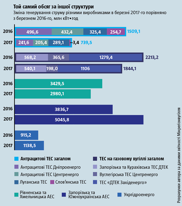 оказалась действительно радикальной. В годовом балансе генерация электроэнергии на март 2017 года планировалась на уровне 14 млрд кВт•ч, тогда как фактически было произведено 13,27 млрд кВт•ч, на АЭС - соответственно 7,6 млрд кВт•ч и 8,03 млрд кВт•ч, на ТЭС - 5,1 млрд кВт•ч и 3,9 млрд кВт•ч, на ГЭС - 0,9 млрд кВт•ч и 1,2 млрд кВт•ч. При этом уменьшение генерации на ТЭС в значительной мере достигли именно благодаря антрацитовым теплоэлектростанциям. Так, антрацитовые ТЭС ДТЭК в Днепропетровской области (Приднепровская и Криворожская) сократили производство с 496,6 млн кВт•ч в марте 2016-го до 241,6 млн кВт•ч в марте 2017 года. Антрацитовые ТЭС государственной Центрэнерго (Трипольская и Змиевская) - с 432,4 до 205,4 млн кВт•ч, а Славянская ТЭС, которую связывают с Александром Януковичем, вообще остановила свою работу и выработала только 3,4 млн кВт•ч, тогда как в марте 2016-го - 254,7 млн кВт•ч. Генерация на Луганской ТЭС ДТЭК упала с 325,4 до 289,1 млн кВт•ч.