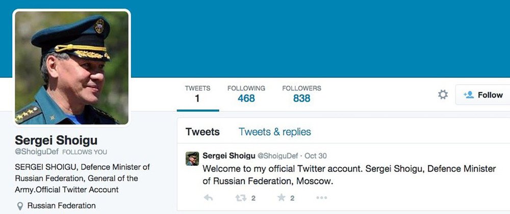Скриншот фейкового аккаунта под именем министра обороны Сергея Шойгу.В августе 2012 года Дебенедетти создал аккаунт под именем министра внутренних дел России Владимира Колокольцева. При помощи поддельной страницы журналист распространил ложное сообщение о смерти президента Сирии Башара Ассада и его жены.