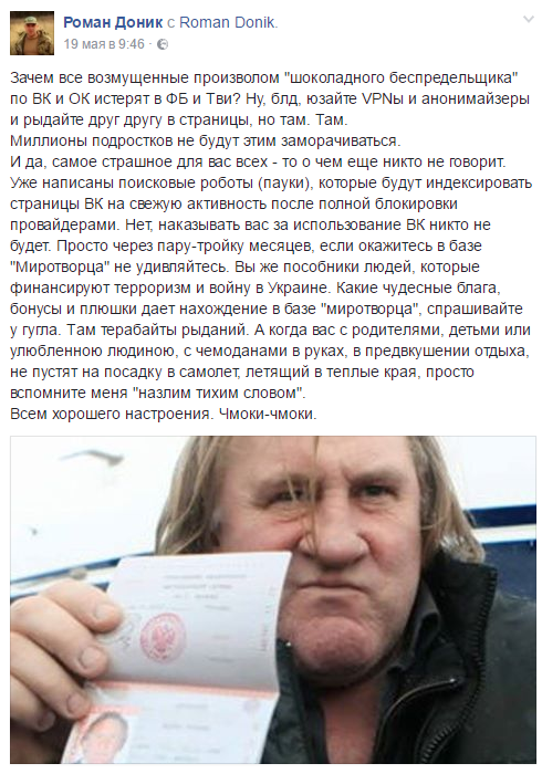 "Юзайте VPNы и анонимайзеры и рыдайте друг другу в страницы, но там. Там. Миллионы подростков не будут этим заморачиваться. И да, самое страшное для вас всех - то о чем еще никто не говорит. Уже написаны поисковые роботы (пауки), которые будут индексировать страницы ВК на свежую активность после полной блокировки провайдерами. Нет, наказывать вас за использование ВК никто не будет. Просто через пару-тройку месяцев, если окажитесь в базе "Миротворца" не удивляйтесь. Вы же пособники людей, которые финансируют терроризм и войну в Украине. Какие чудесные блага, бонусы и плюшки дает нахождение в базе "миротворца", спрашивайте у гугла. Там терабайты рыданий. А когда вас с родителями, детьми или улюбленною людиною, с чемоданами в руках, в предвкушении отдыха, не пустят на посадку в самолет, летящий в теплые края, просто вспомните меня "назлим тихим словом", - написал на этот счет волонтер Роман Доник на своей странице в Facebook.