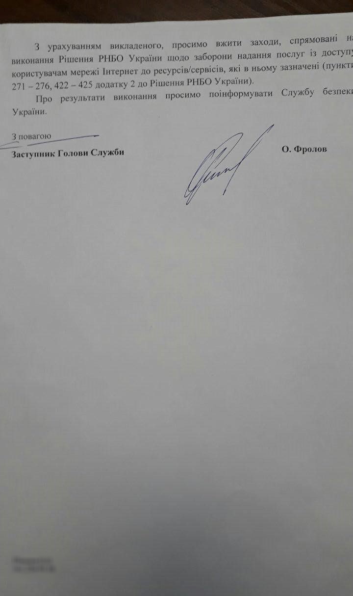 "Просим принять меры, направленные на выполнение решения СНБО о запрете доступа пользователям сети к ресурсам... О результатах выполнения просим проинформировать Службу безопасности Украины", - говорится в соответствующем документе за подписью заместителя главы СБУ Олега Фролова, который оказался в распоряжении "Страны".