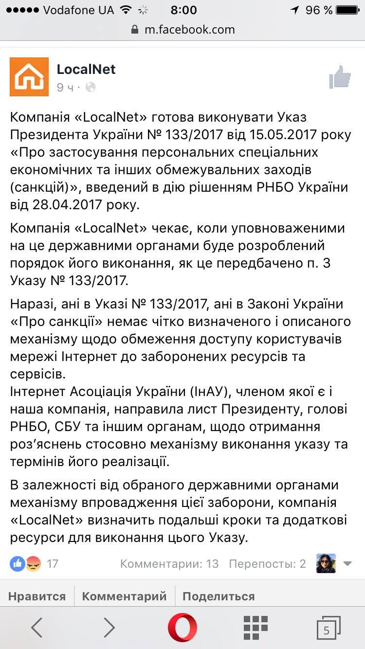 Впрочем, далеко не все провайдеры воспринимают эти рекомендации. Киевская компания LocalNet пообещала своим клиентам, что не будет отключать российские сайты до тех пор пока не получит разъяснения от государственных органов.
