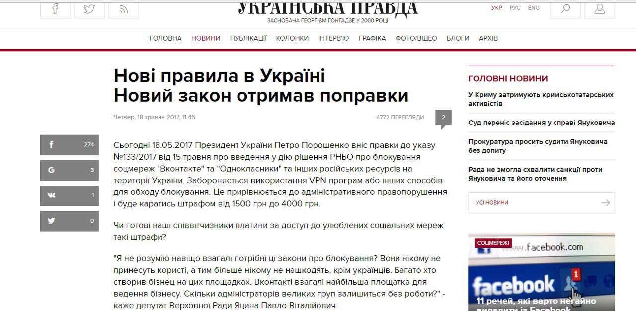 Итак, в фейковой новости, которой нет и никогда не было на сайте УП, указано, что 18 мая президент Петр Порошенко внес правки в "санкционный указ", установив запрет на все способы обхода блокировки запрещенных сайтов. Наиболее важное - потенциальным нарушителям якобы светит штраф в размере от 1500 до 4000 гривен.