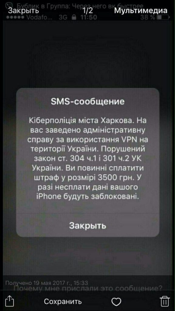 "На вас заведено административное дело за использование VPN на территории Украины. Нарушен закон - ч.1 ст.304 и ч.2 ст.301 УК Украины. Вы должны оплатить штраф в размере 3500 гривен. В случае неоплаты ваш iPhone будет заблокирован", - гласит послание, которое несколькими способами пытаются разогнать в сети.