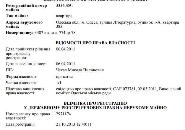 Николай Чекал имеет большой опыт работы в правоохранительных органах: прошел путь от рядового оперативного сотрудника до начальника управления налоговой милиции. Уже в 1999 году семейство могло позволить себе покупку квартиры в Одессе (278 кв. метра), а в 2006 – внедорожник премиум-класса Lexus RX 330. На данный момент 13-летний автомобиль оценивается в 350 тыс.гривен на сайтах по продаже подержанных авто.