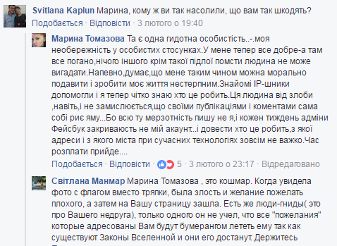 Резонансные фото начали активно распространять пользователи сети, сопровождая их агрессивными комментариями. Украинцы угрожали "набить падлюке морду", взывали к помощи СБУ, предлагали отправить ее "грузом 200" в Россию или на Донбасс, жаловались администрации Facebook, желали смерти.