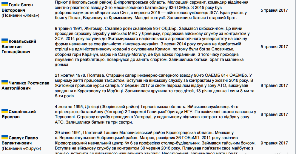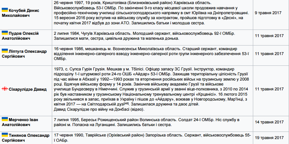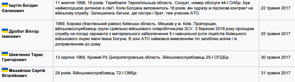 Ниже - поименный список погибших в мае 2017 года украинских военных.